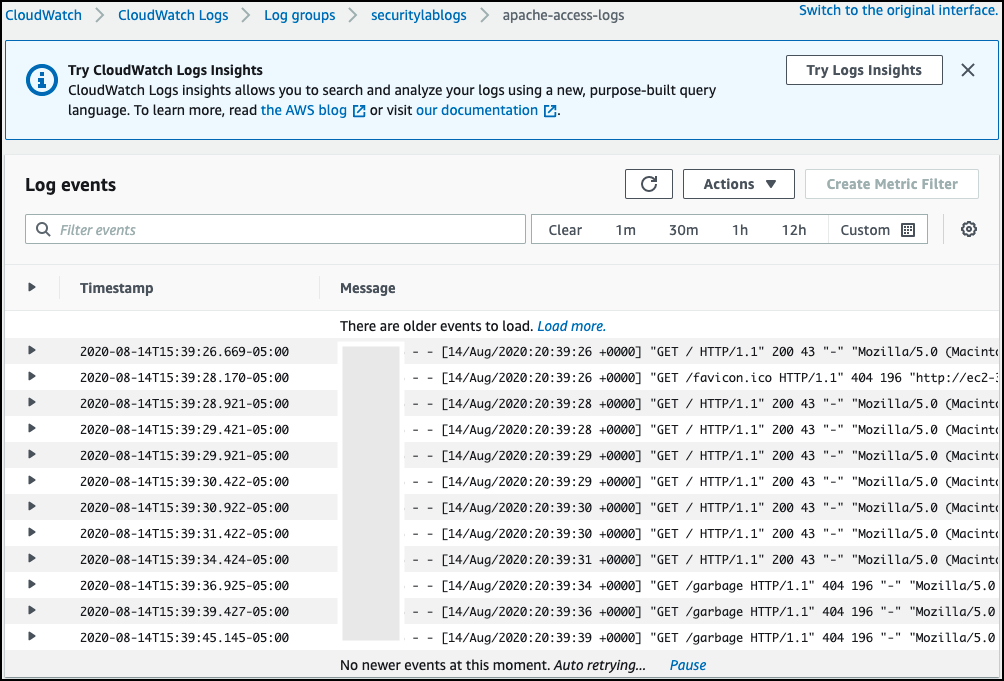 Rather than monitor your logs manually, you can also set up Metric Filters in AWS: